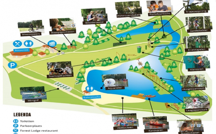 Het 16 ha. grote terrein is gelegen in een rustig bosrijke omgeving en omvat 2,5 ha. water. De accommodatie is onderverdeeld in diverse woonunits van verschillende grootte. Iedere groep beschikt over een eigen woonunit, afgestemd op de groepsgrootte, bestaande uit een dagverblijf, 2, 4, 6 of 8 persoons slaapkamers en een sanitaire gelegenheid. 's Avonds is de gezellige bar in het restaurant geopend. Sportief, afwisselend, origineel en betaalbaar!De maaltijden worden in het restaurant ‘Green Garden’ genuttigd. Dit gebeurt via een buffet. Er kan zoveel gegeten worden als men wil, alleen vleeswaren en fruit is beperkt.
